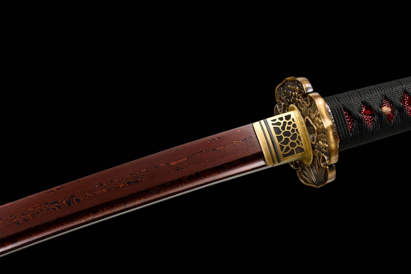 Blade (刀身): Forged from red Damascus steel with a roasted finish, the blade reveals intricate wave patterns across its surface. Each fold captures the balance between beauty and lethal precision, reflecting the skill of traditional swordsmithing.