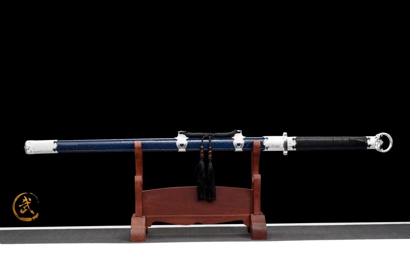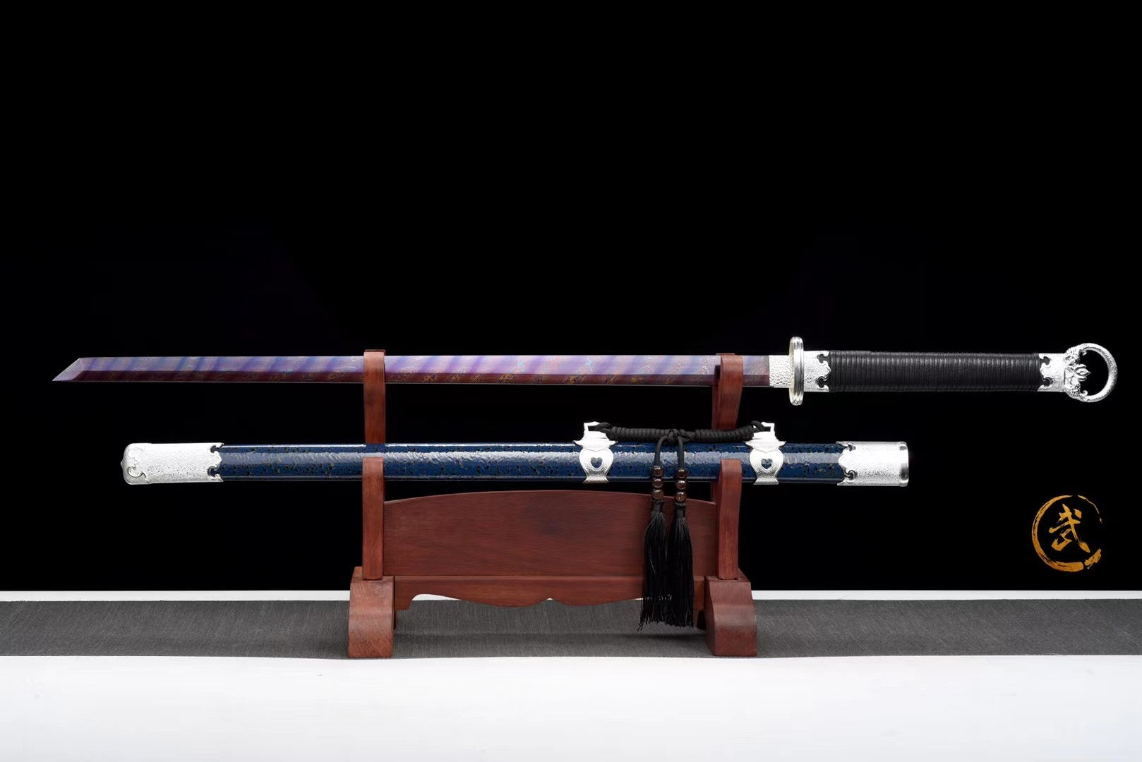 The Aokage Ninjatō — “Blue Shadow Blade” — embodies the elegance of stealth. Its Damascus blade shimmers in shades of indigo and violet, symbolizing calm power and deadly precision. With silver accents and a deep blue lacquered scabbard, this sword captures the mystique of the night — a perfect balance between artistry and lethality.