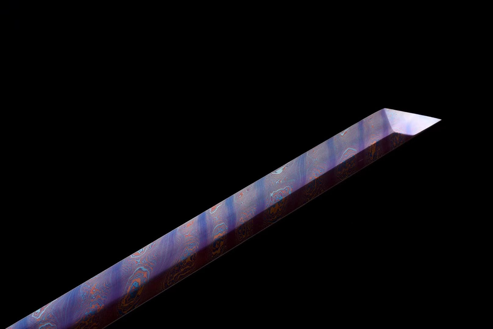 Blade (刃): Folded Damascus steel baked in blue tones, creating unique layered patterns with violet and crimson reflections.