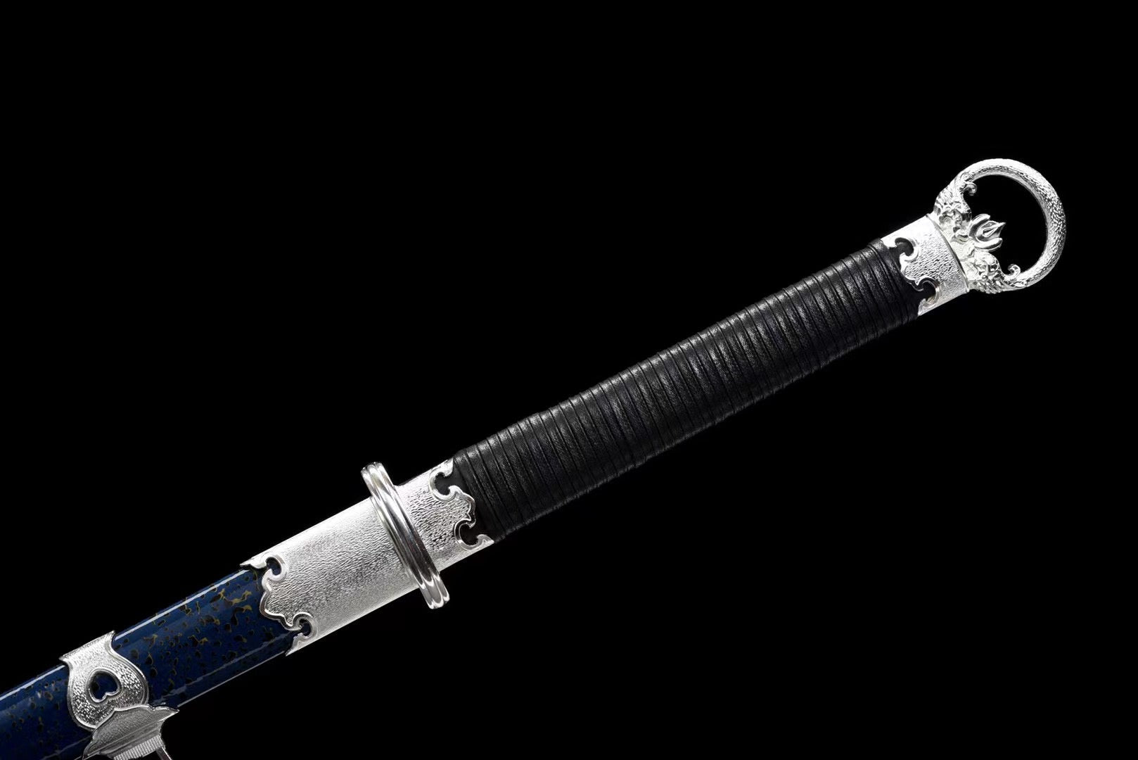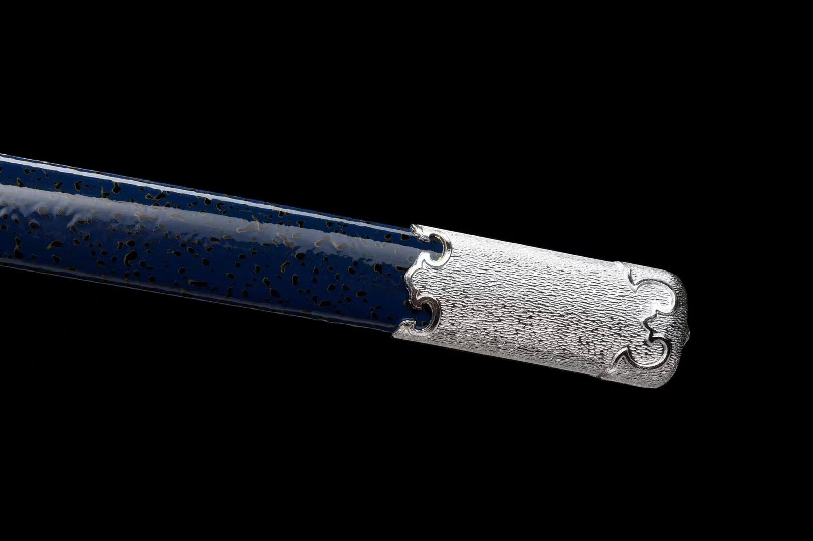 Scabbard (Saya 鞘): Deep navy lacquered wood with black and gold speckling, adorned with silver fittings and dual ring suspension.