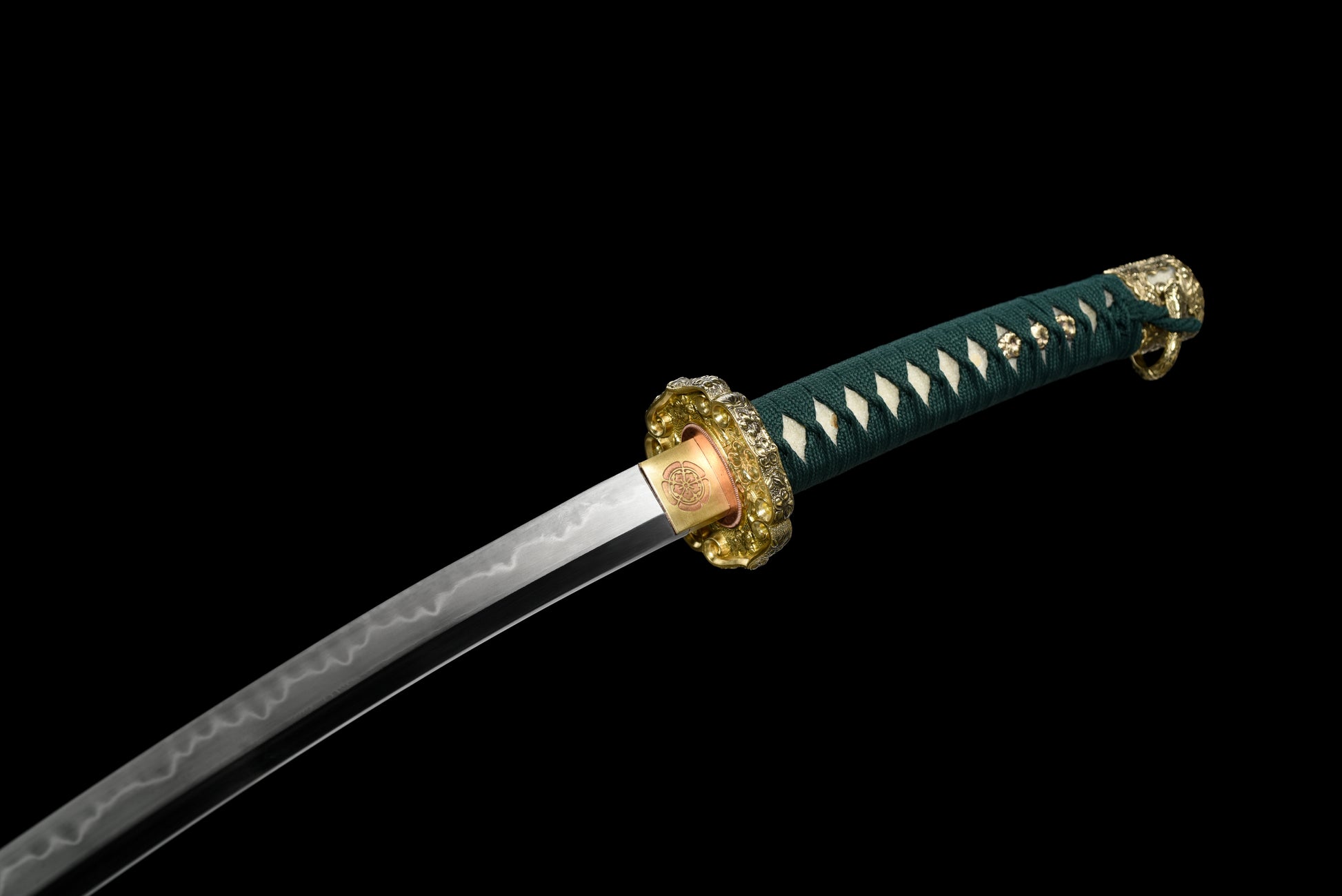 The Aokaze Katana (青風), meaning “Blue Wind,” is a symbol of grace and strength. Its refined green-gold aesthetics and authentic T10 hamon blade make it a perfect balance between art and weaponry.