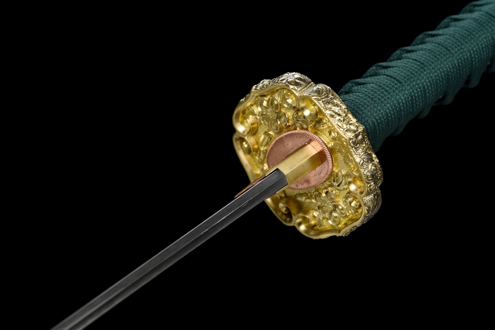 Guard (Tsuba 鍔): The ornate golden tsuba, crafted from solid copper, is decorated with hand-carved floral designs representing prosperity and harmony.