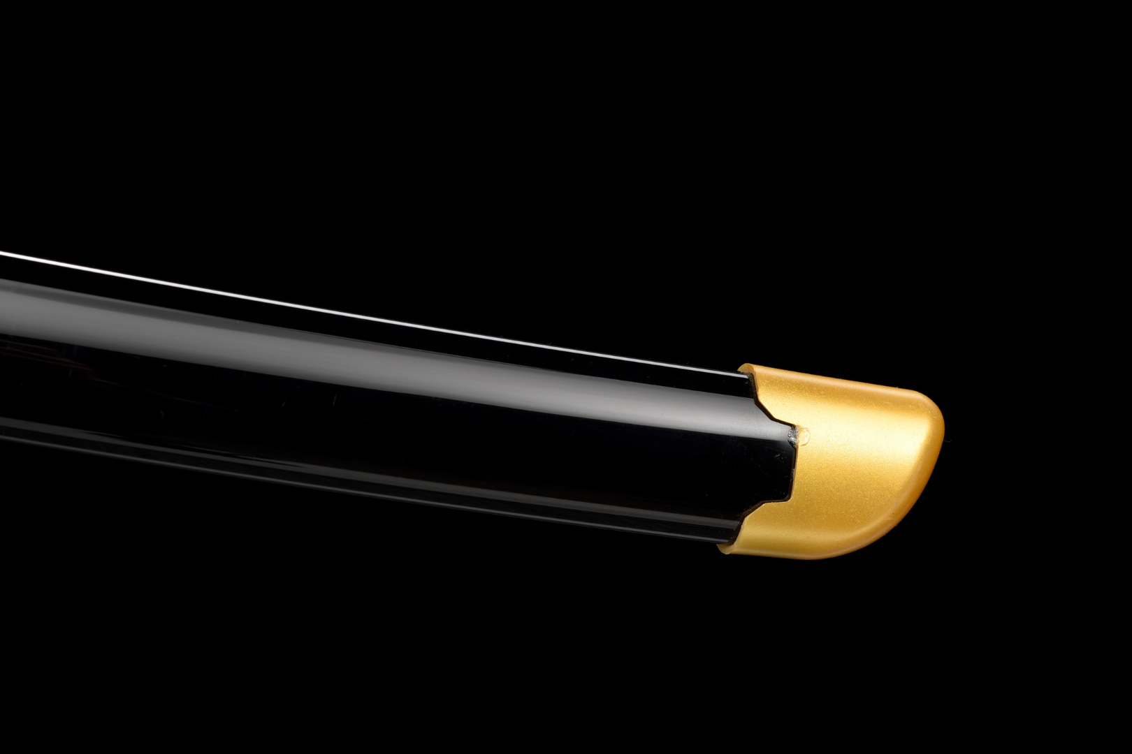 Scabbard (Saya 鞘) — Glossy black lacquer finish with a golden cap for a luxurious aesthetic.