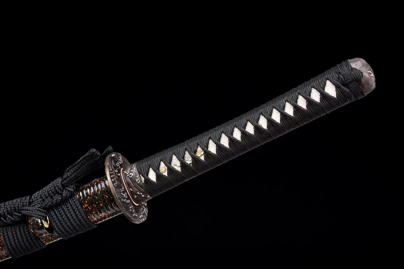 Scabbard (Saya 鞘): A deep black lacquered saya enhances the katana’s mysterious presence, completed by a matching black sageo cord — simplicity that hides deadly intent.