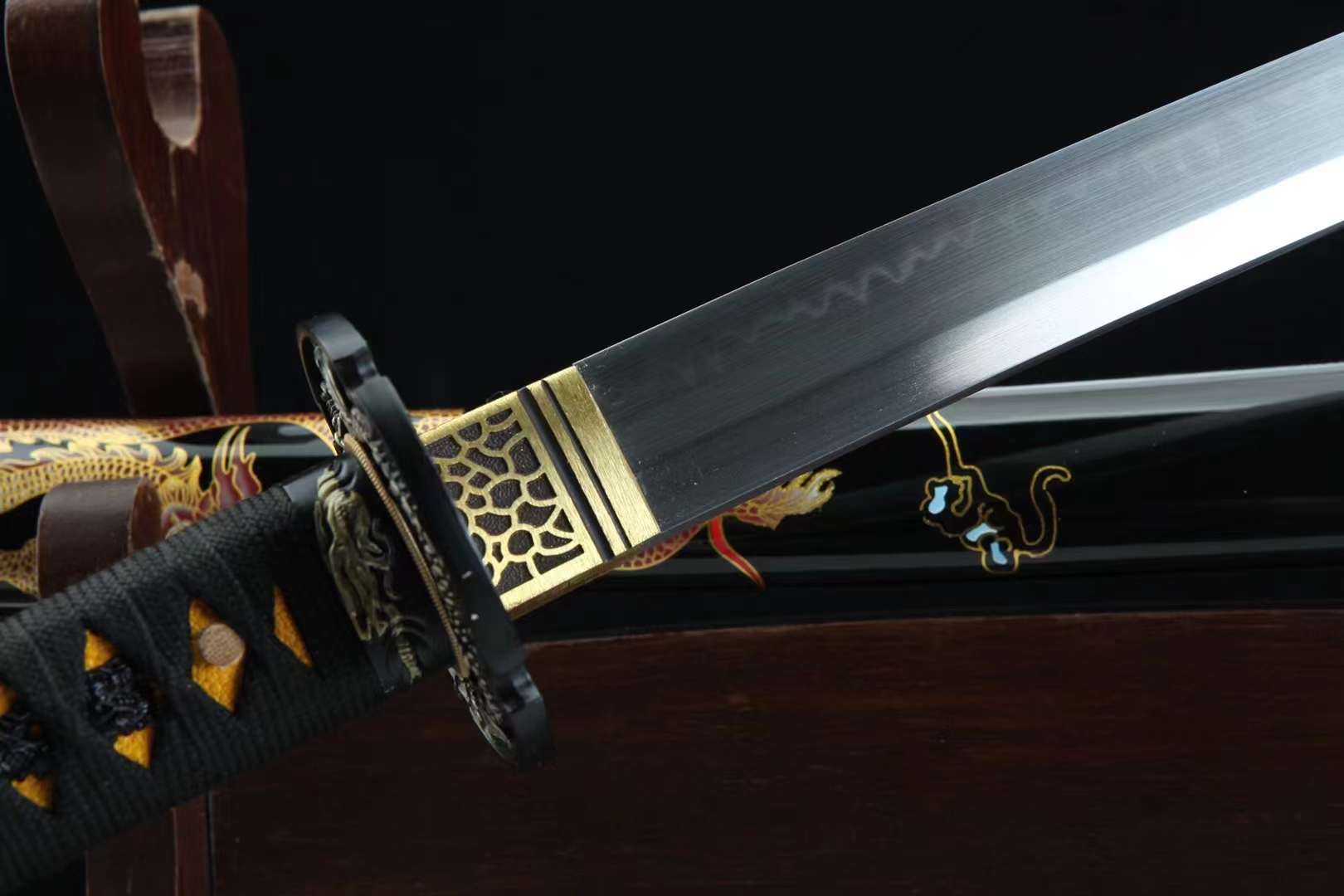 Guard (Tsuba 鍔): The tsuba features an intricately carved dragon in motion, a timeless emblem of strength, prosperity, and vigilance. Finished in aged black alloy with golden highlights.