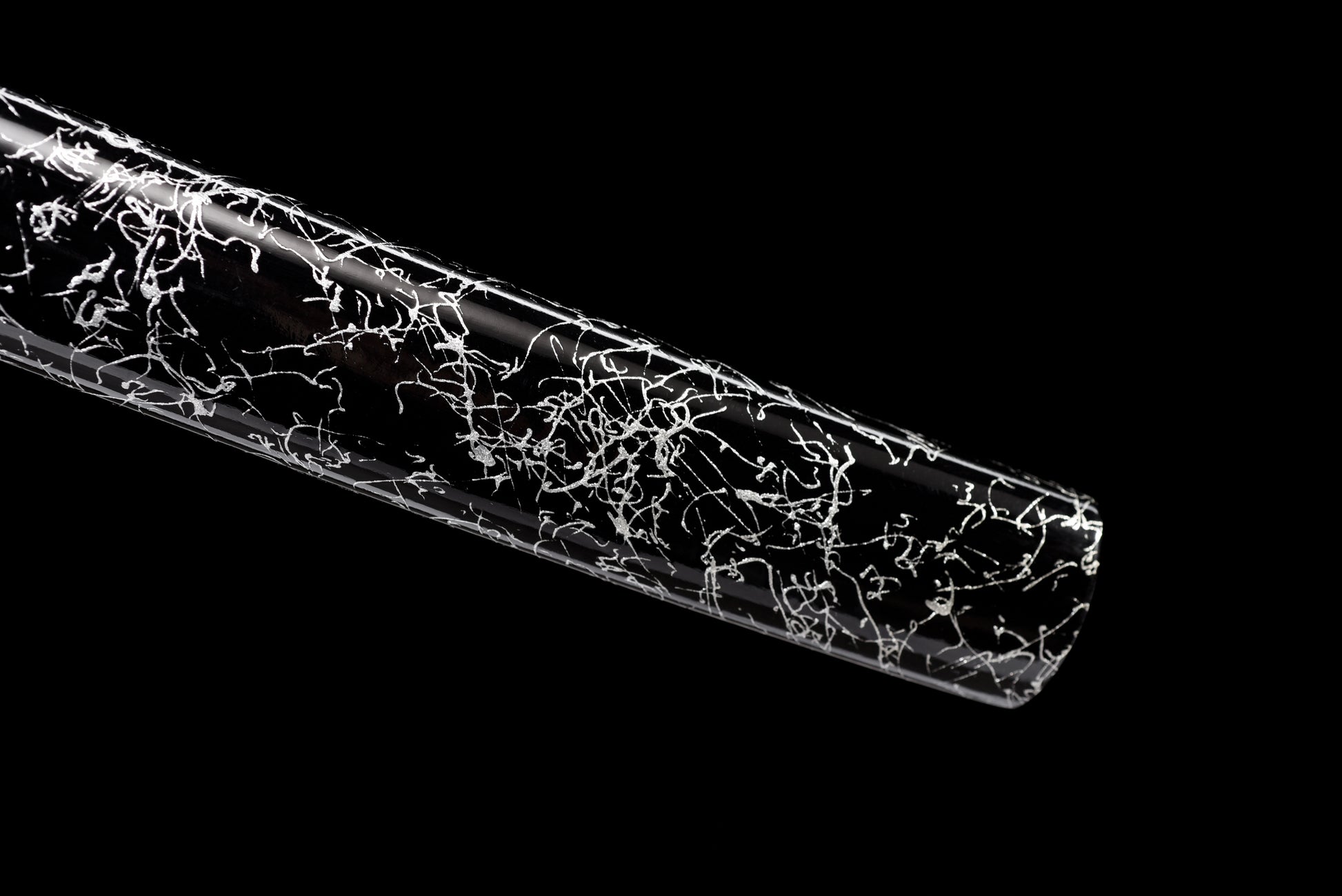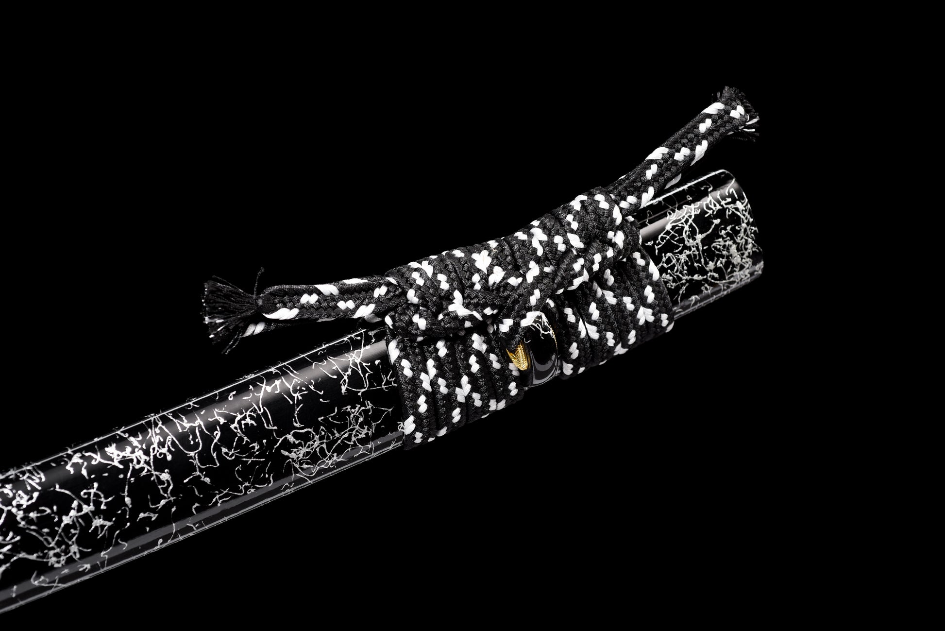 | Scabbard (Saya 鞘) | Glossy black saya with white marble lacquer texture and matching black-white sageo cord |