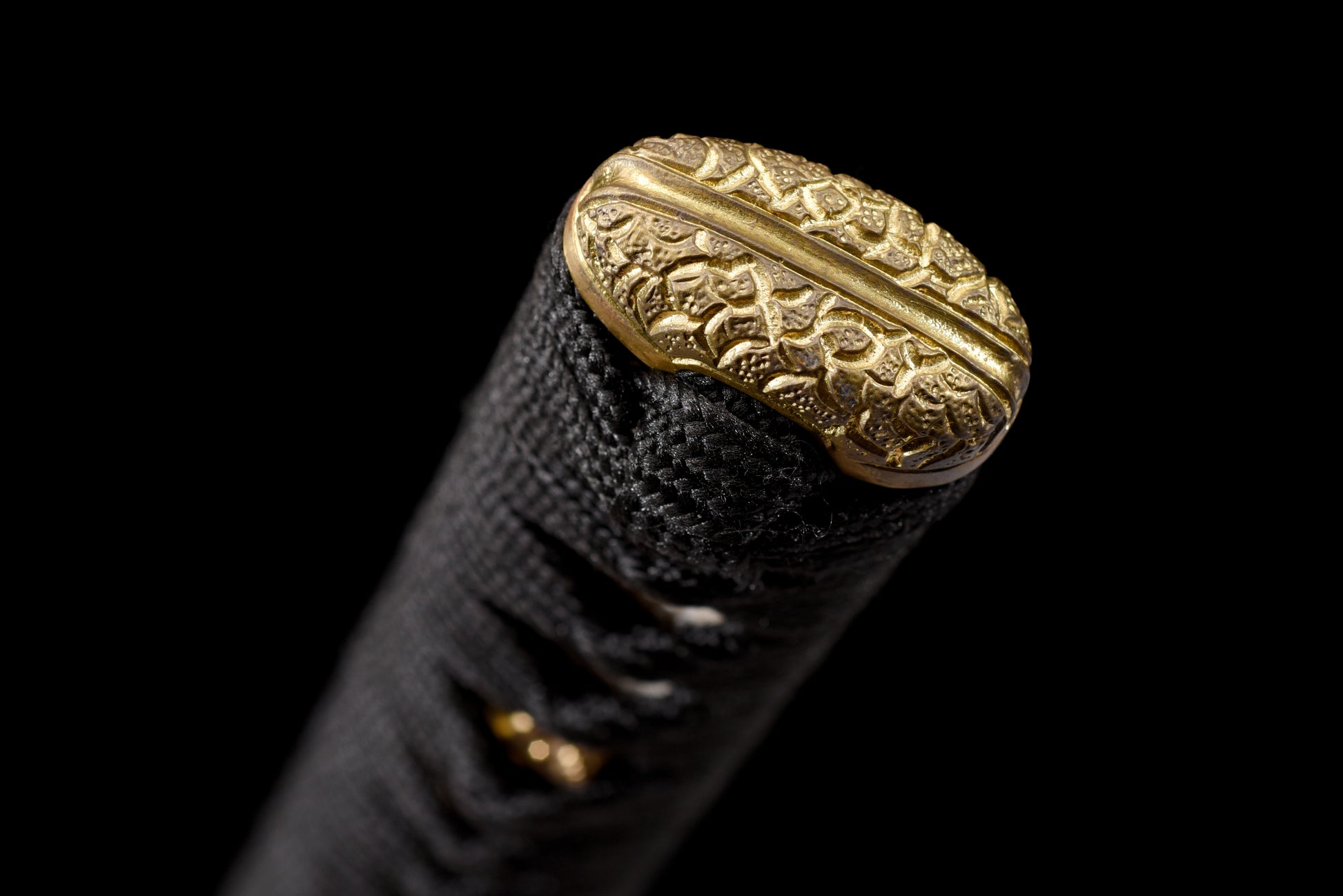 | Handle (Tsuka 柄) | Black cotton ito over white ray skin (samegawa) with golden menuki ornaments |