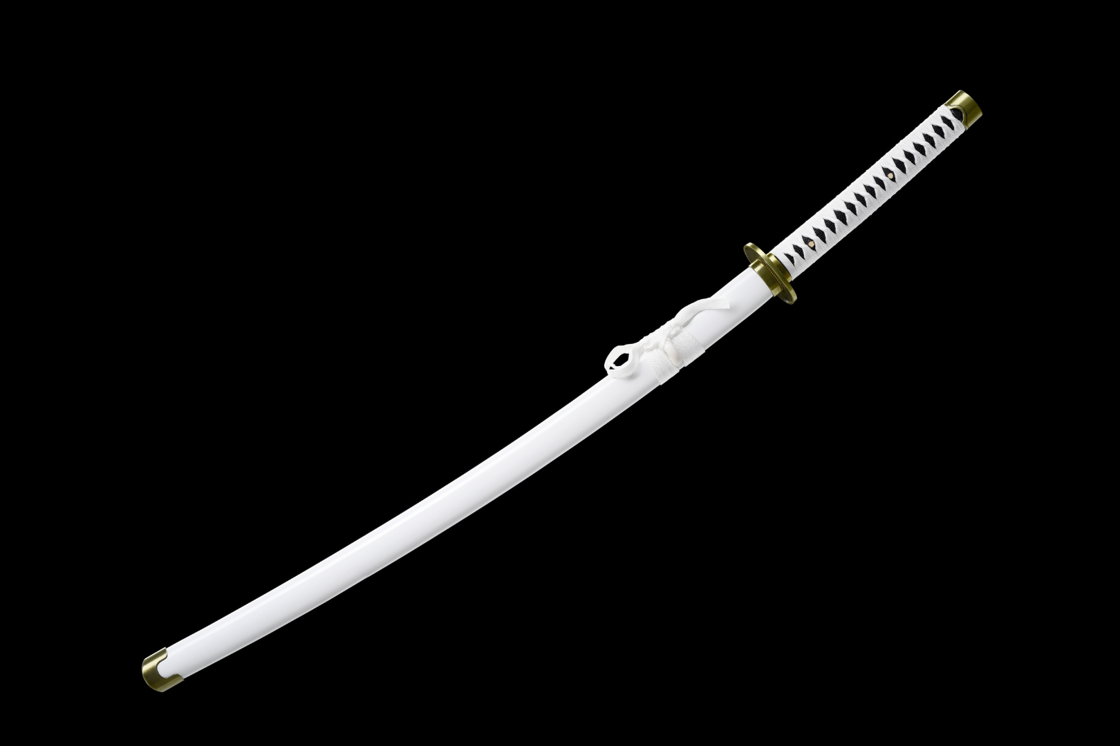 The Wado Ichimonji Katana stands out with its sleek design and superior build. The 1060 carbon steel blade is meticulously sharpened for a realistic finish. A sculpted iron tsuba pairs harmoniously with the white lacquered wood saya and matching white sageo. The tsuka, wrapped in black rayskin with white cord, provides a comfortable, solid grip. Copper ornaments and two bamboo pegs attest to the sword’s durability and quality.