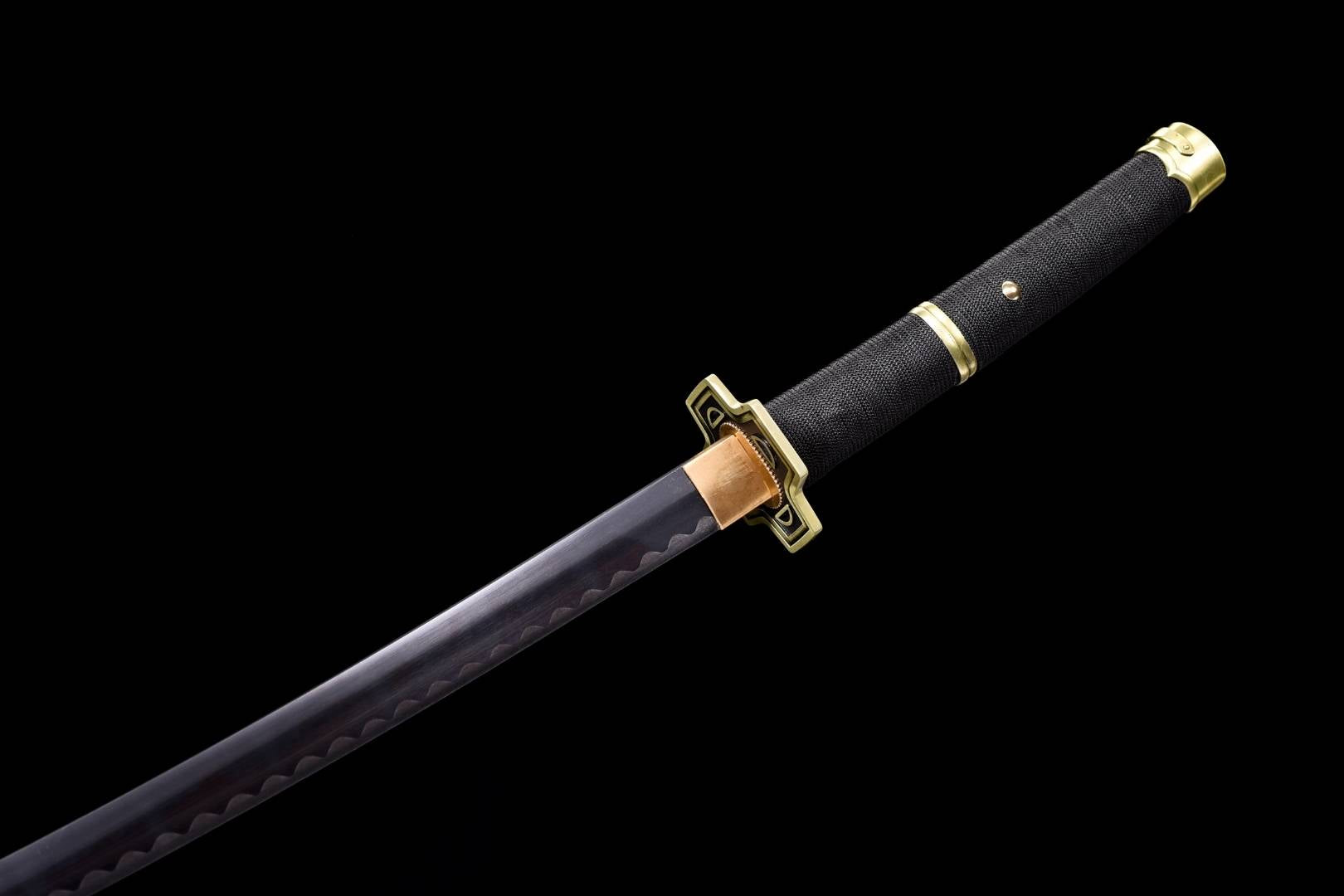 The black lacquered wooden scabbard protects the blade and makes the sword easy to carry. The handle is covered with black cord, offering a comfortable grip and an aesthetic faithful to the original.