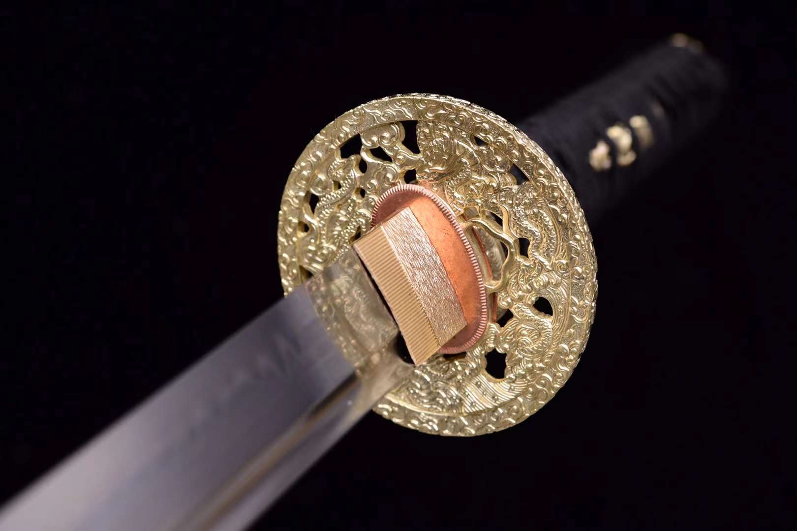 Handle (Tsuka 柄): Wrapped in traditional black silk over white ray skin, the tsuka provides a refined grip complemented by gold-finished ornaments representing longevity and harmony.