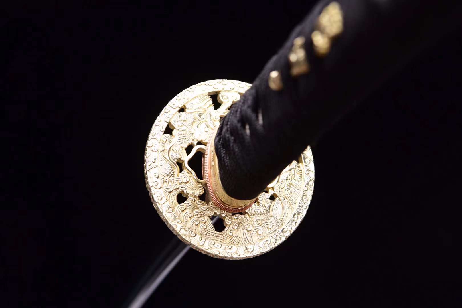 | Handle (Tsuka 柄) | Black silk ito wrap over white ray skin (samegawa), with gold menuki ornaments |