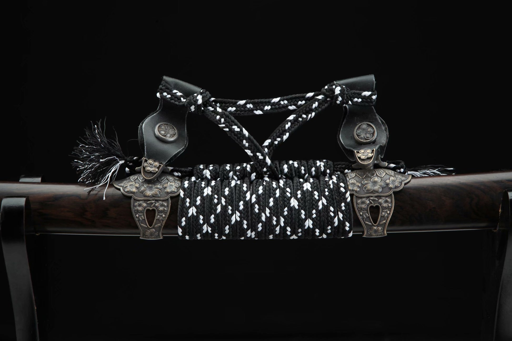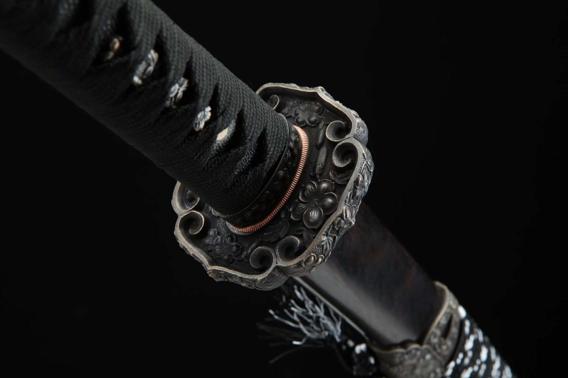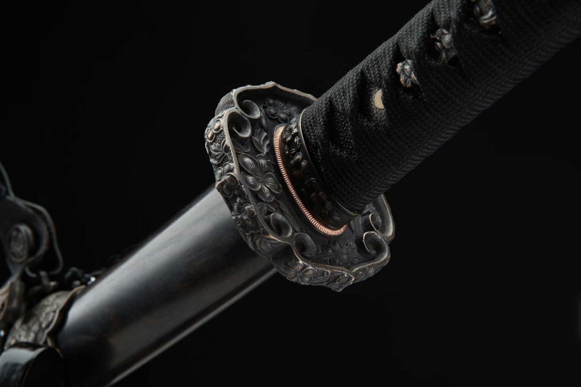 Scabbard (Saya 鞘): Made from polished ebony wood with carved copper details, combining luxury and strength.