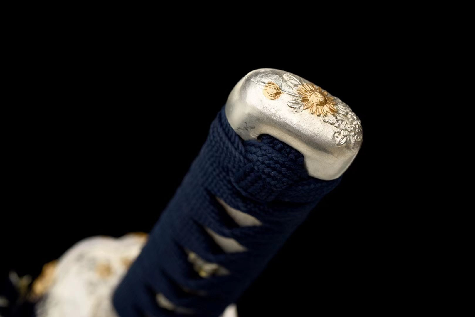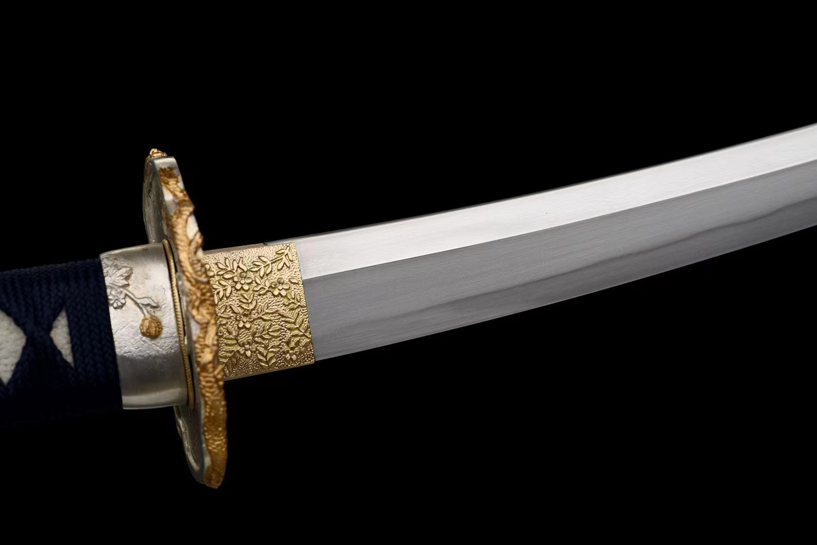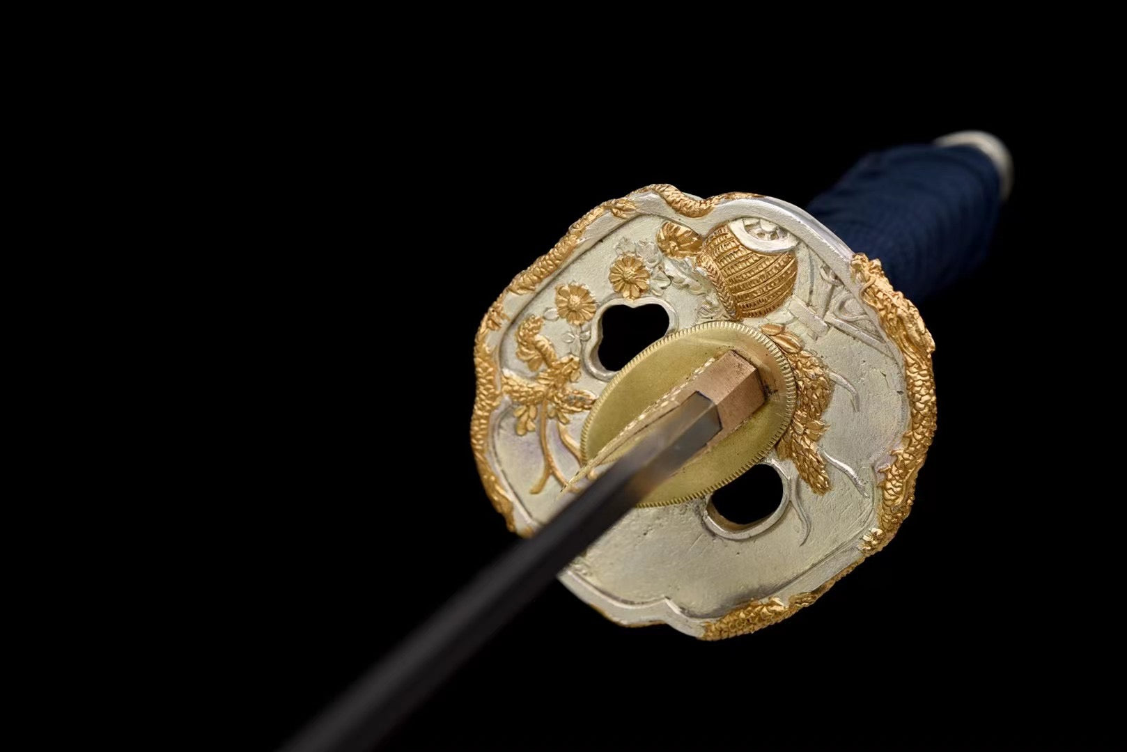 The carved copper guard, gold and silver plated, features delicate floral patterns. The deep blue lacquered wood scabbard with gold details adds a touch of elegance and sophistication. The Sageo, in blue and white, harmoniously complements the ensemble.