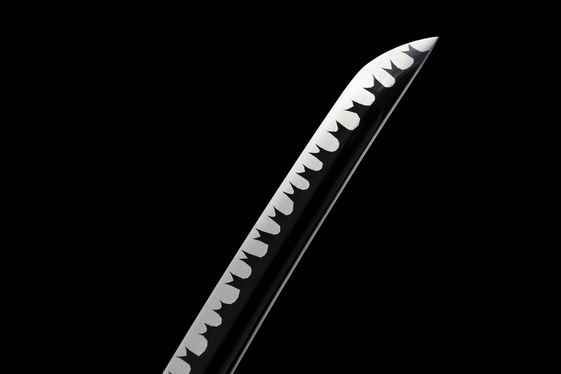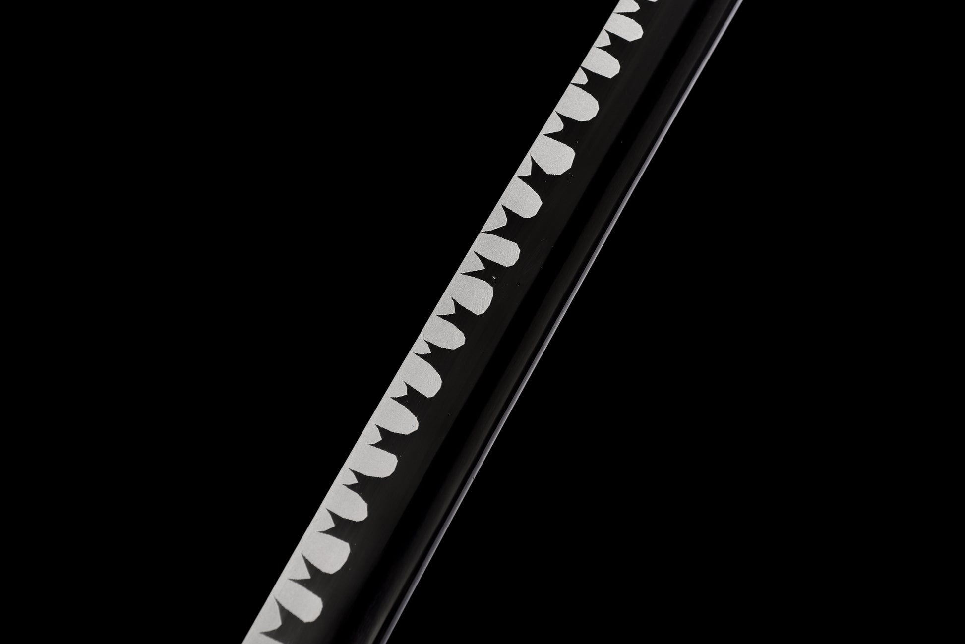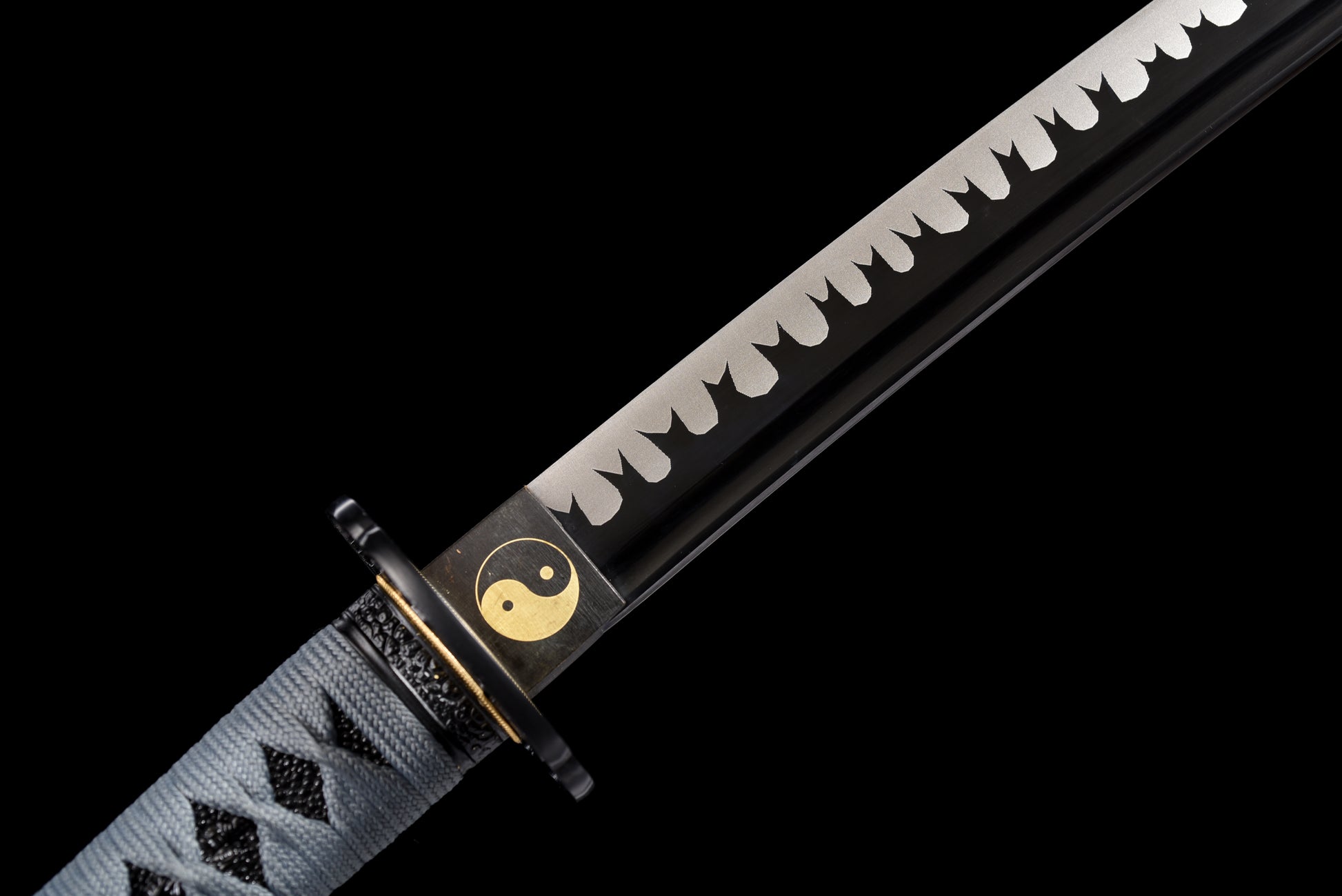 Blade (刀身): Forged from durable high manganese steel, the blade is finished in a mirror-black polish with engraved silver wave patterns along the edge and a gold Taijitu (Yin-Yang) emblem near the habaki.