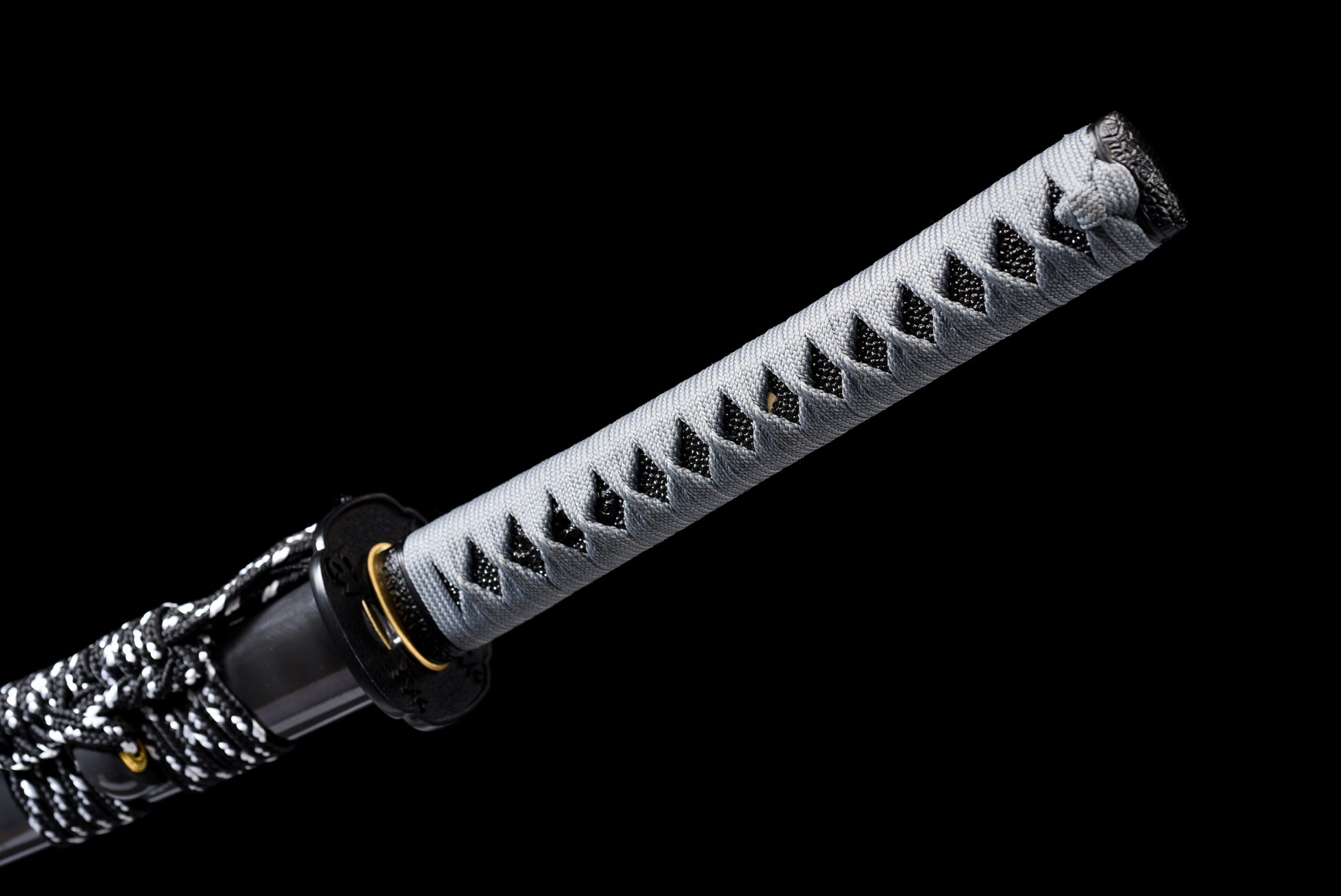 | Handle (Tsuka 柄) | Grey cotton ito wrap over black ray skin (samegawa) Alloy menuki detailing Double bamboo mekugi for secure tang attachment |